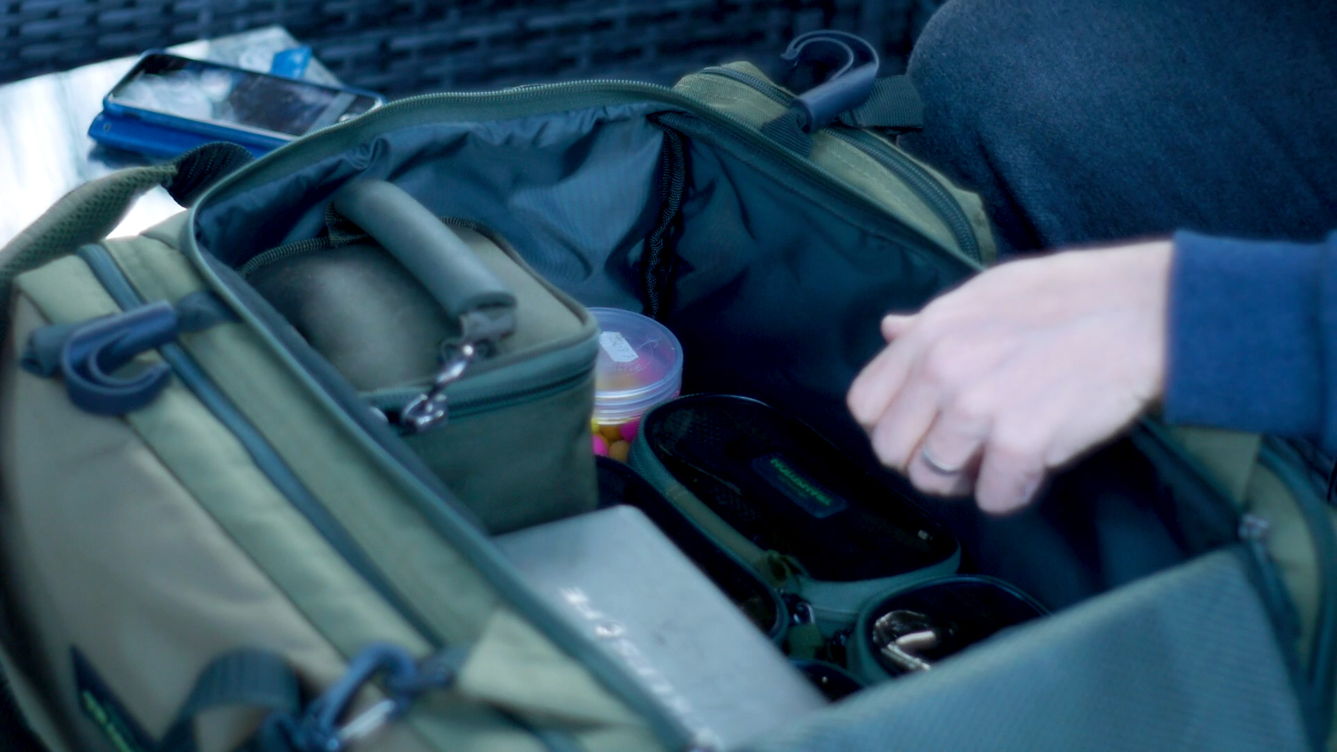 As I prefer short and regular fishing sessions, I don’t take a huge amount of tackle with me and fish with a single rod. All my terminal tackle packs neatly into my Korum Ruckbag. This supports my mobile approach, with all my essentials in one place and my unhooking mat, landing net handle and rod rest attached to the ruckbag.